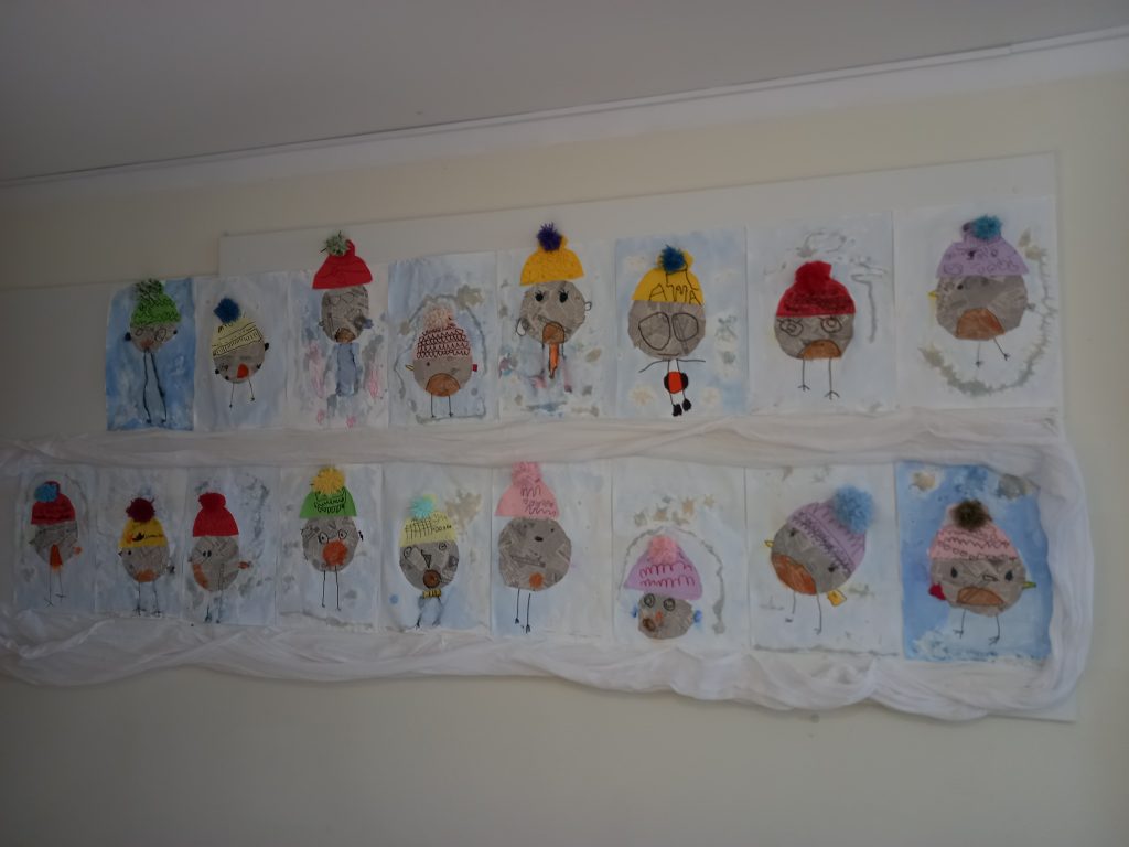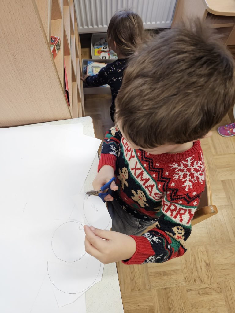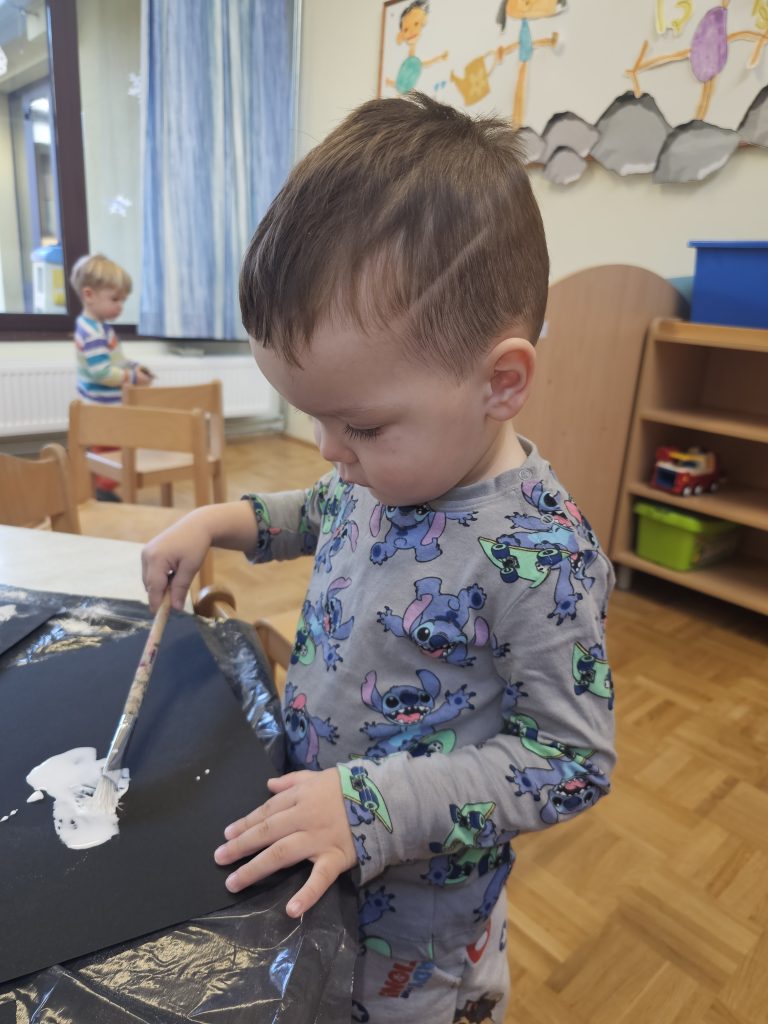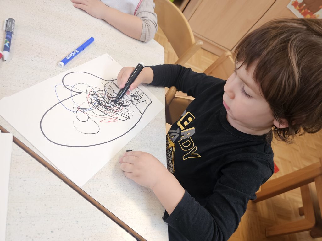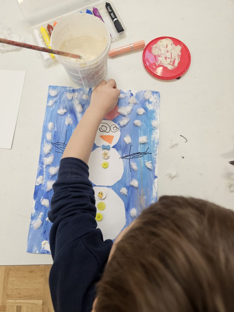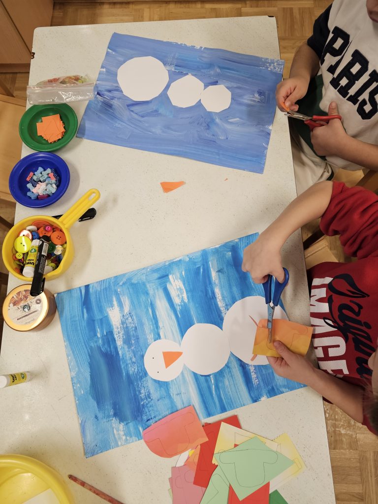 Otroci so po poslušanju pravljice Snežnosek svoje vtise in domišljijo izrazili z risbo. Likovno ustvarjanje se je nadaljevalo z izdelovanjem sneženega moža, pri čemer so otroci razvijali ustvarjalnost, natančnost ter domišljijo.