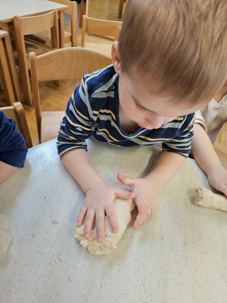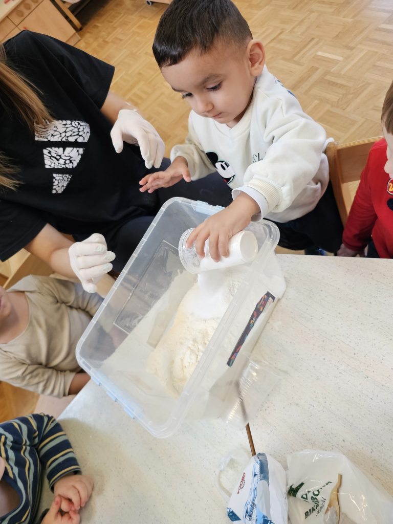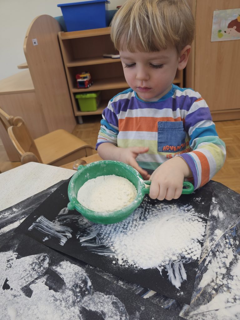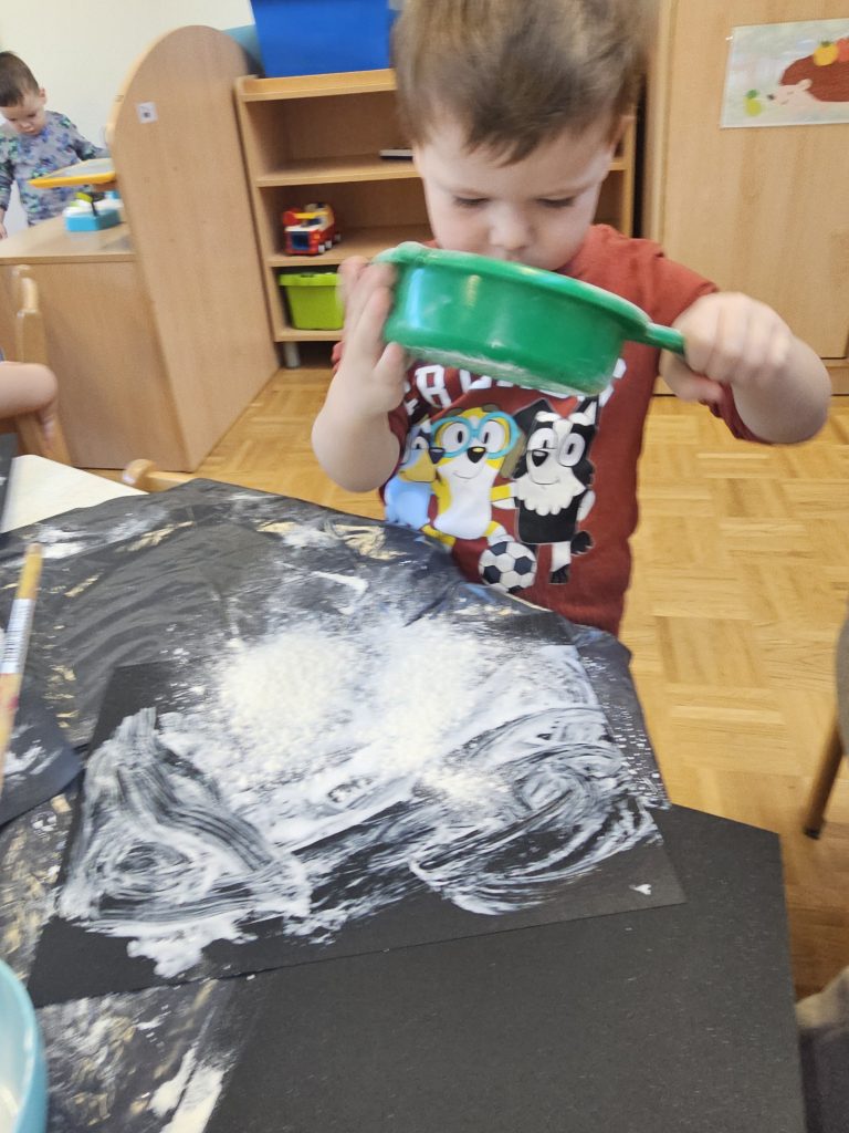 Ker smo si zaželeli snega, smo presipali moko na črn papir in ustvarjali stopinje v snegu. Nato smo razmišljali, kako bi lahko naredili snežaka, ter prišli do ideje, da ga lahko oblikujemo iz slanega testa.