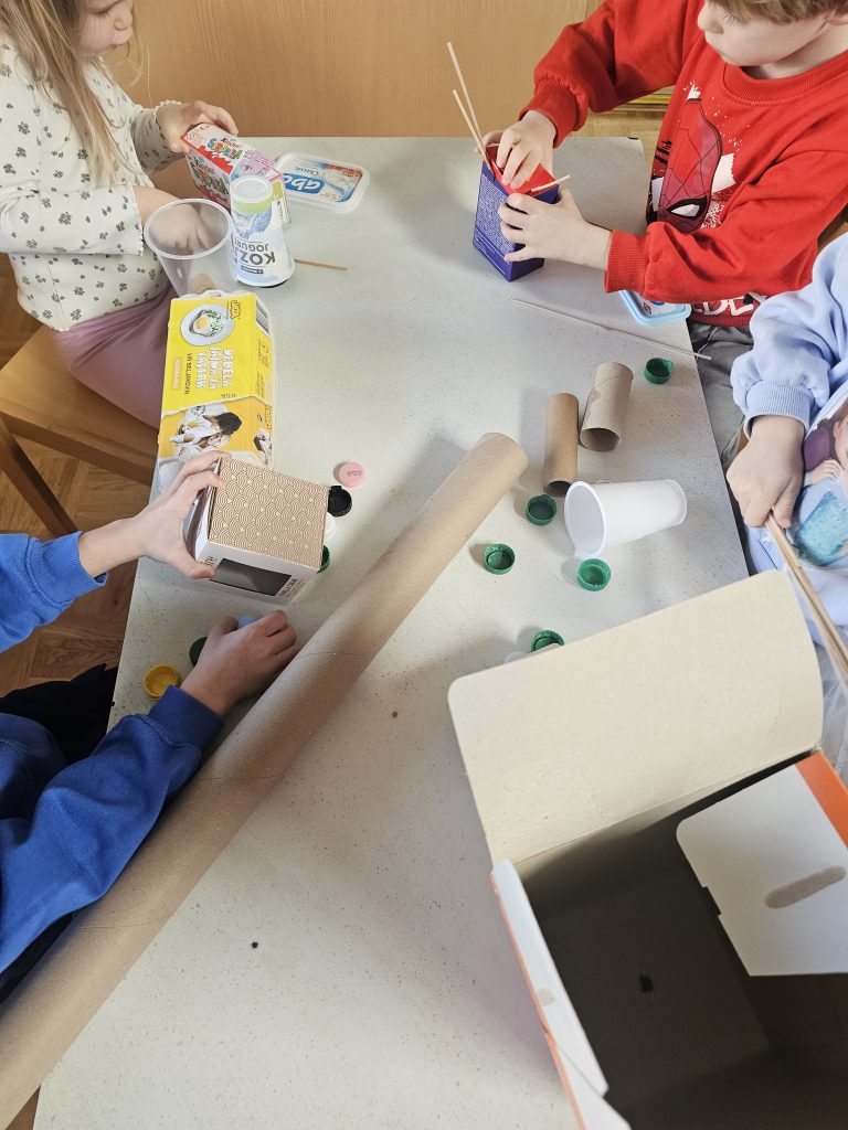 Otroci so v okviru projekta Domišljija ne pozna meja zbirali odpadni material, zato so v ta namen umaknili vse igrače. Dva tedna so se igrali, ustvarjali, raziskovali in tudi gibalno izražali z nestrukturiranim materialom, iz česar se je razvila tudi zamisel za izvedbo vadbene ure z uporabo odpadnega materiala.