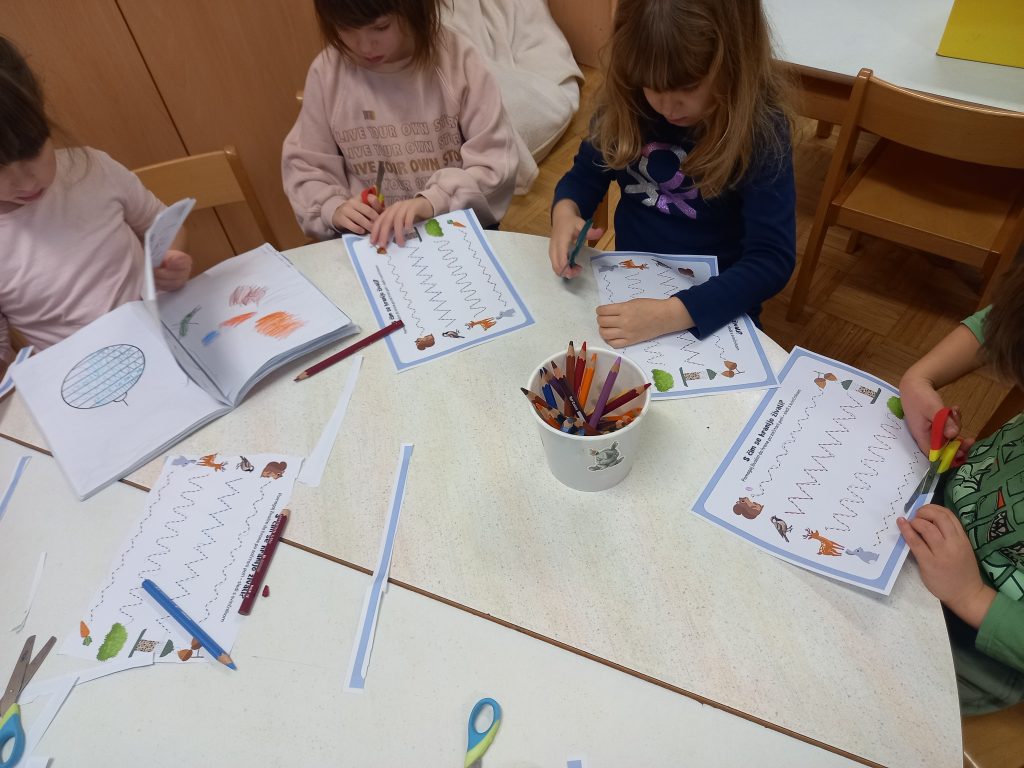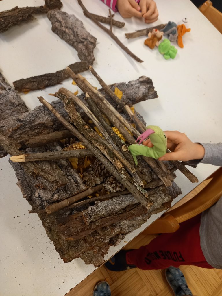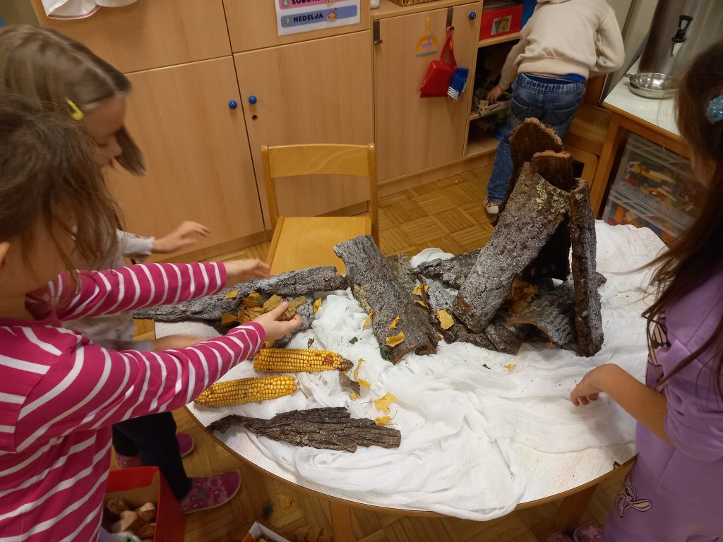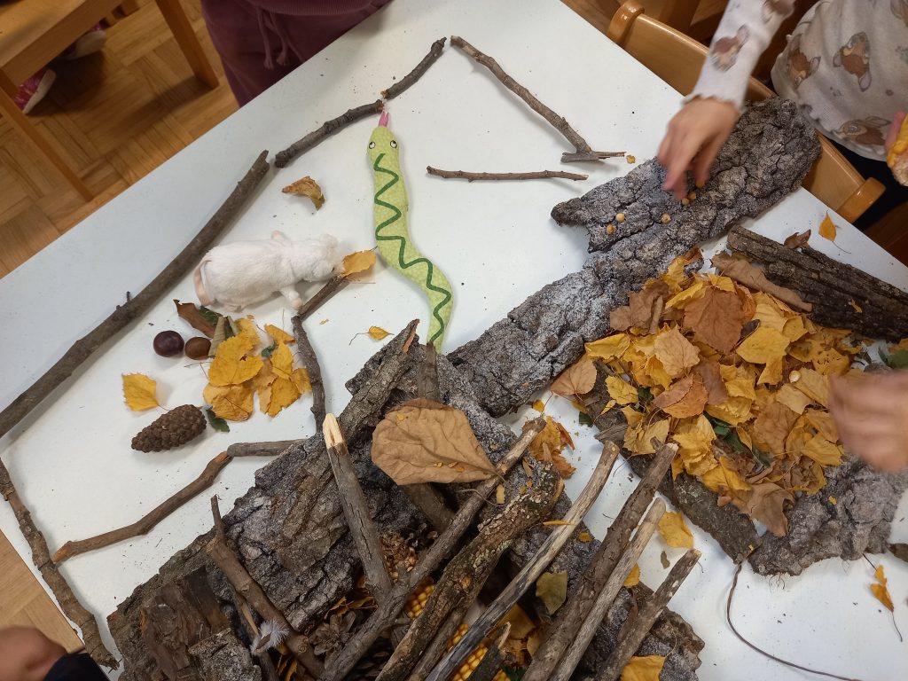 Otroci so z veseljem ustvarjali z naravnimi materiali, gradili brloge, oblikovali živali iz plastelina ter likovno izražali svoja doživetja. Preko pravljic, pesmi, ugank in lutkovnih iger so razvijali jezik, domišljijo, poslušanje in socialne veščine. Pri reševanju delovnih listov so urili grafomotoriko, pozornost, vztrajnost ter utrjevali jezikovno-slikovne in matematične spretnosti.