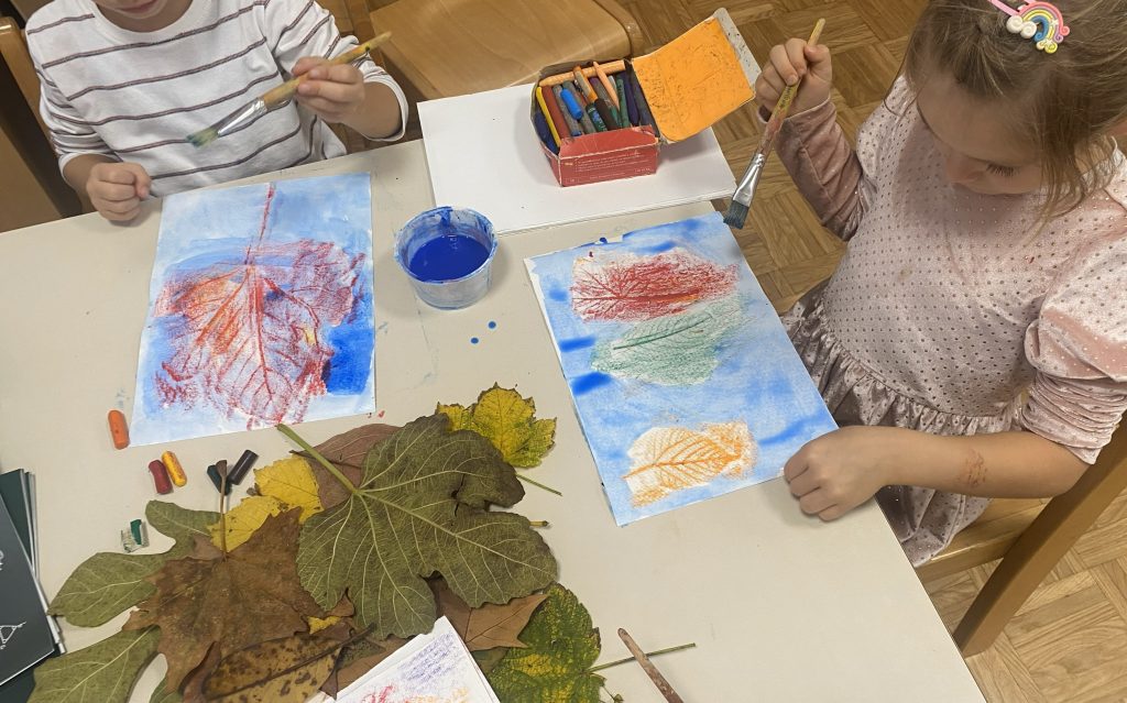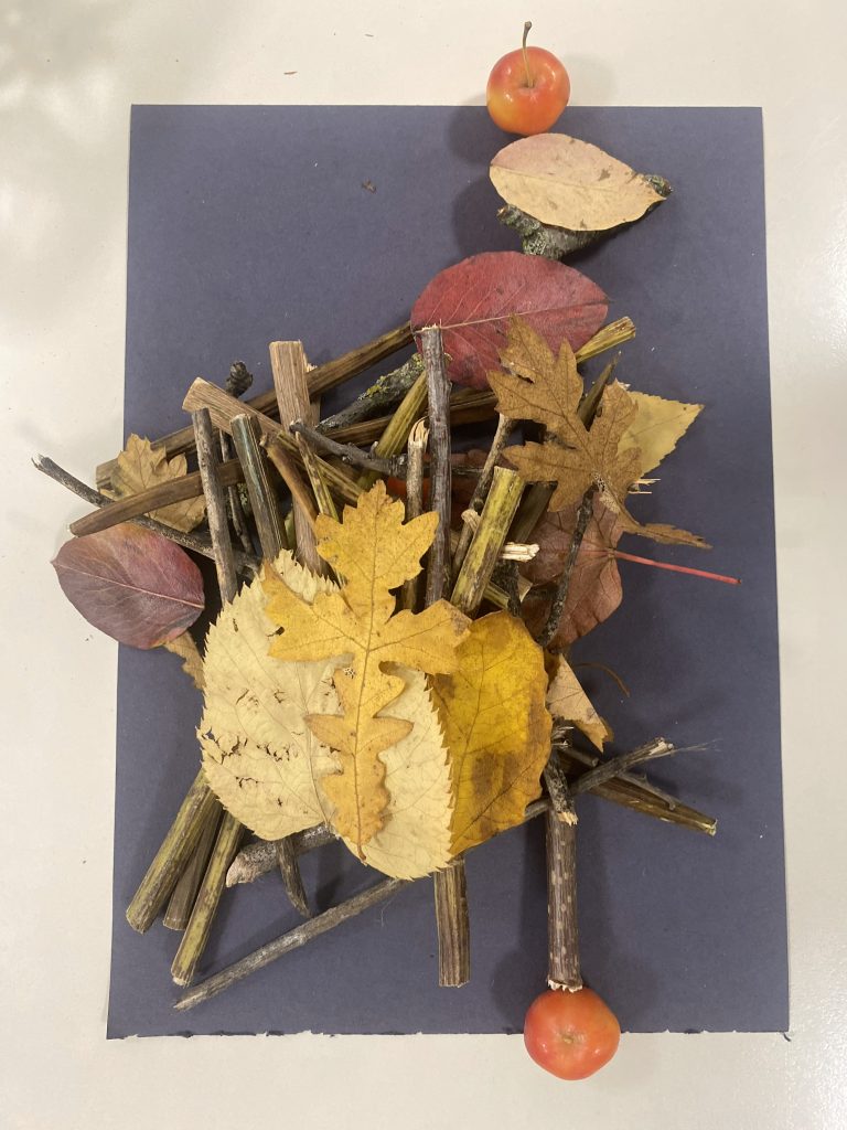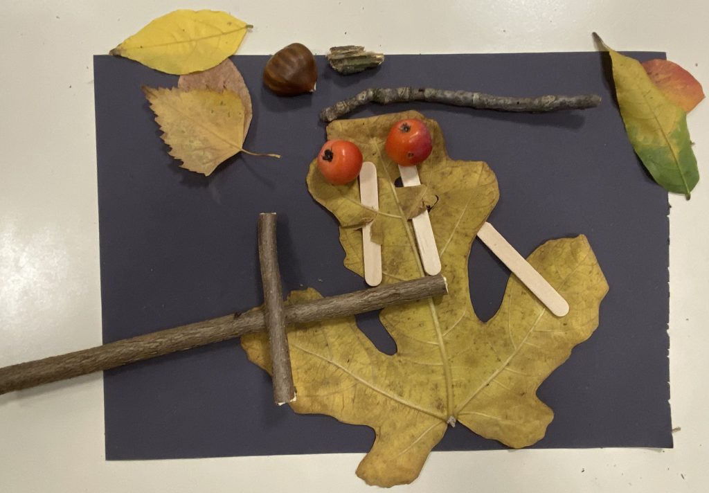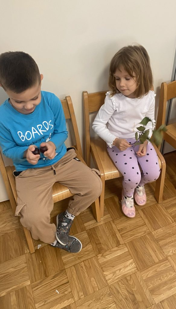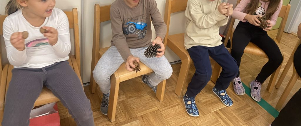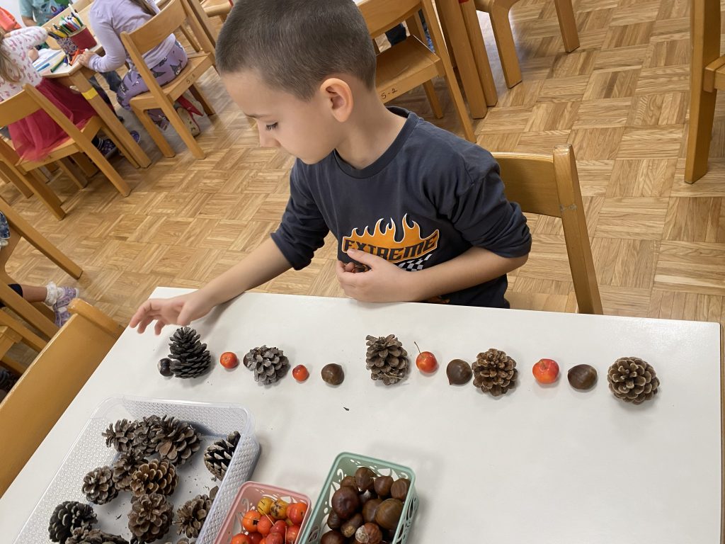 V skupini 5-6 let so otroci raziskovali jesenske naravne materiale, ki smo jih skupaj nabirali med sprehodom in jih prinašali od doma. Služili so nam kot odlična izhodišča za učenje skozi igro ter za izvajanje različnih dejavnosti na vseh področjih. Jesenske plodove in drugo rastje so tipali, vohali ter z zanimanjem opazovali in opisovali njihove različne barve, oblike in teksture. Na likovnem področju so otroci z listi ustvarjali odtise tako, da so pod papir položili list, nato po površini drgnili z voščenko in tako odkrili njegove žile in obliko. Naravni material so polagali na temno podlago, pri tem spoznavali osnovne likovne elemente: točko, črto in ploskev. Razvijali so občutek za razporeditev, barve, oblike ter z veseljem opisovali svoje nastajajoče umetnine. Naravne materiale smo uporabili tudi na glasbenem področju. Otroci so ob petju jesenskih pesmi ustvarjali spremljavo z drgnjenjem storža ob storž, udarjanjem kostanja ob kostanj, tresenje vejic z listjem … ter raziskovali različne zvoke in načine igranja. Z listjem smo izvedli tudi gibalno-plesne dejavnosti. Spuščali smo listje in opazovali njegovo padanje in premikanje v zraku, nato pa so gibanje listja otroci posnemali s svojim telesom. Na matematičnem področju so naravne materiale urejali po velikosti, razvrščali po obliki ter nadaljevali vzorce.