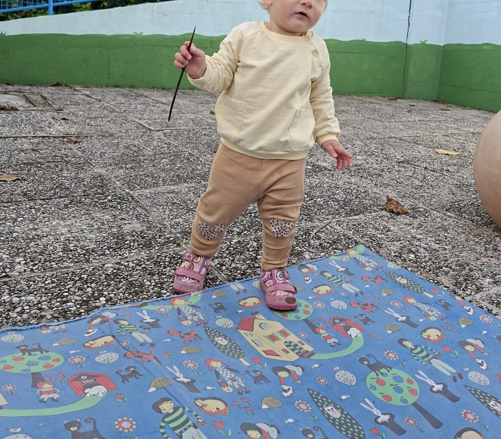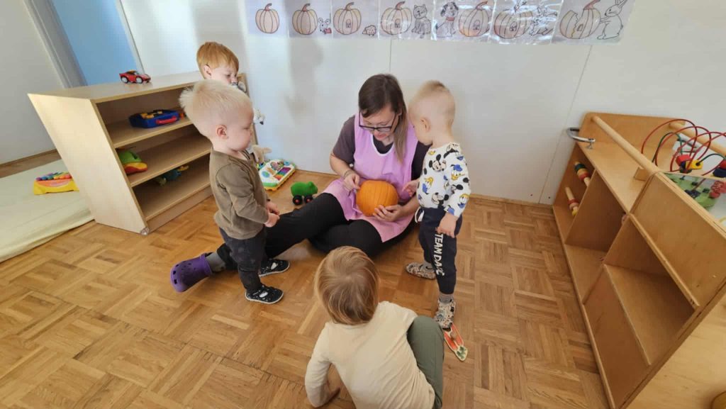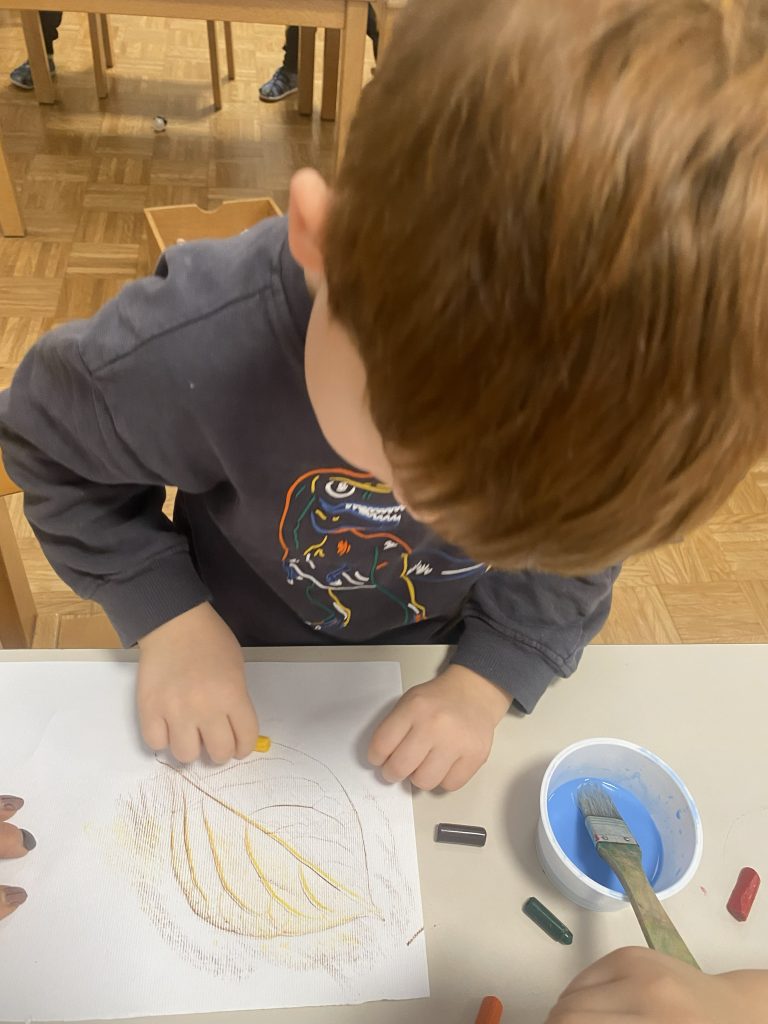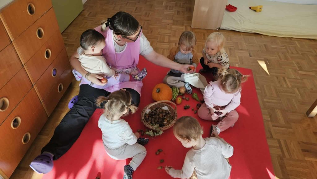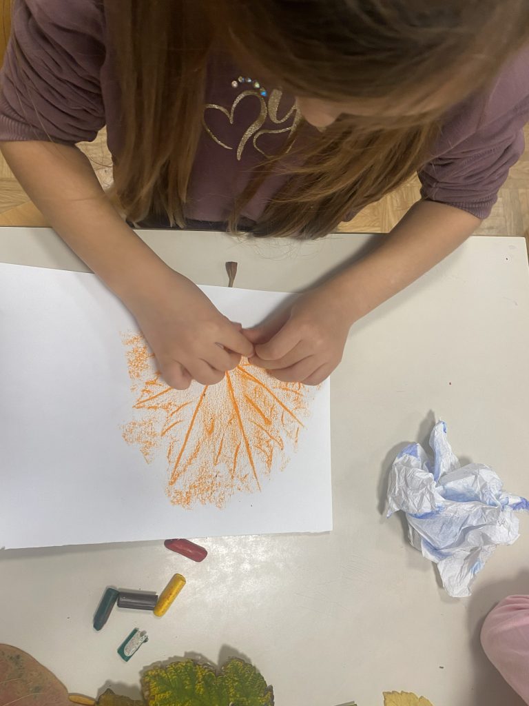 V skupini 5-6 let so otroci raziskovali jesenske naravne materiale, ki smo jih skupaj nabirali med sprehodom in jih prinašali od doma. Služili so nam kot odlična izhodišča za učenje skozi igro ter za izvajanje različnih dejavnosti na vseh področjih. Jesenske plodove in drugo rastje so tipali, vohali ter z zanimanjem opazovali in opisovali njihove različne barve, oblike in teksture. Na likovnem področju so otroci z listi ustvarjali odtise tako, da so pod papir položili list, nato po površini drgnili z voščenko in tako odkrili njegove žile in obliko. Naravni material so polagali na temno podlago, pri tem spoznavali osnovne likovne elemente: točko, črto in ploskev. Razvijali so občutek za razporeditev, barve, oblike ter z veseljem opisovali svoje nastajajoče umetnine. Naravne materiale smo uporabili tudi na glasbenem področju. Otroci so ob petju jesenskih pesmi ustvarjali spremljavo z drgnjenjem storža ob storž, udarjanjem kostanja ob kostanj, tresenje vejic z listjem … ter raziskovali različne zvoke in načine igranja. Z listjem smo izvedli tudi gibalno-plesne dejavnosti. Spuščali smo listje in opazovali njegovo padanje in premikanje v zraku, nato pa so gibanje listja otroci posnemali s svojim telesom. Na matematičnem področju so naravne materiale urejali po velikosti, razvrščali po obliki ter nadaljevali vzorce.