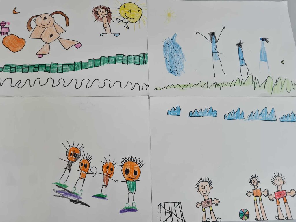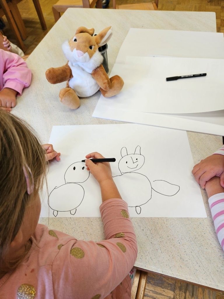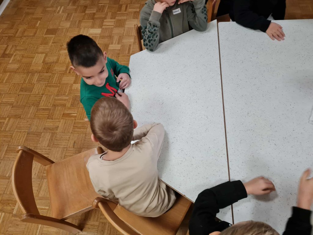 V krogu smo se pogovarjali kaj pomeni biti strpen in kako se obnašamo do tistih, ki nam niso najljubši prijatelji. Nato so otroci izžrebali enega od prijateljev in o njem povedali nekaj lepega. Vsak pa je na risalni list narisal sebe in svojega prijatelja/prijateljico in kaj najraje počneta skupaj.