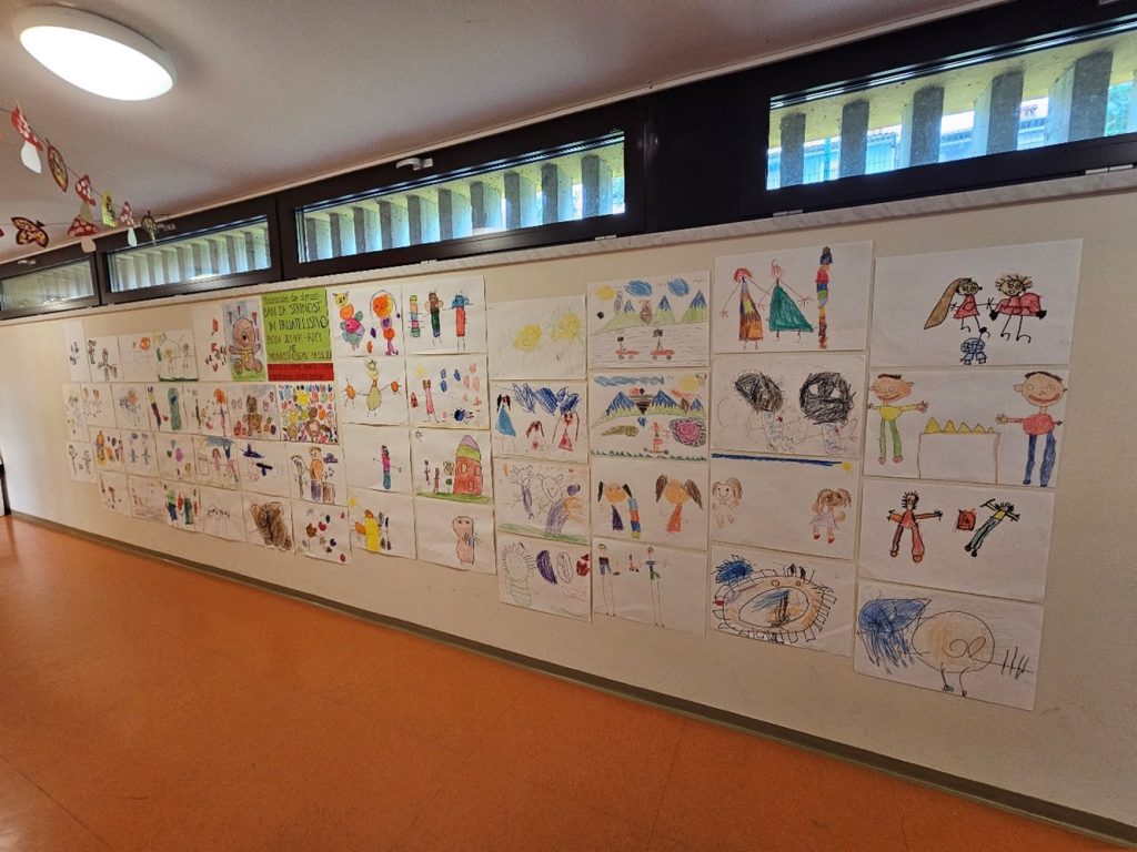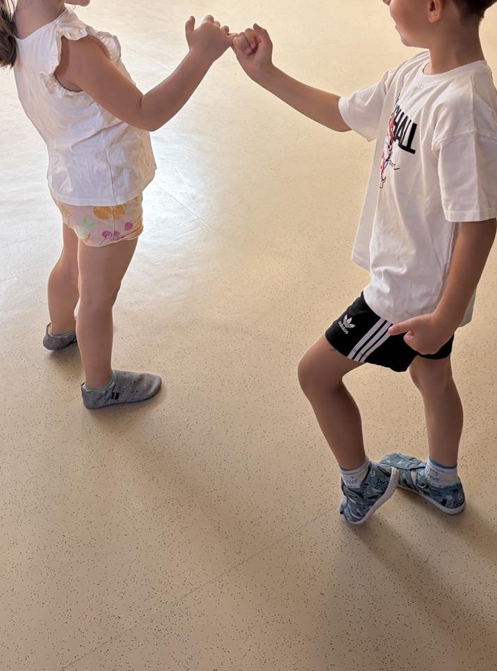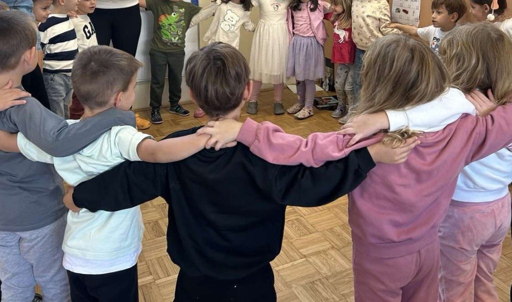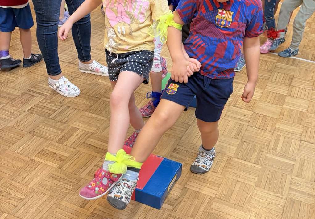 Med gibalno dejavnostjo so se otroci preizkusili v reševanju gibalnih problemov v parih. Par je imel zavezane roke in noge. Premagovali so ovire, čez katere so se morali drug drugemu prilagoditi, se dogovarjati, biti pozorni eden na drugega, saj so morali delovati kot eno. Izmislili so si tudi prijateljski pozdrav z dotikom dela telesa – koleno, komolec, rame ipd. Slikali so na temo medsebojne pomoči in prijateljstva – “Moji junaki strpnosti”. Skupaj smo zapeli in zaplesali ter se povezali v verigo prijateljstva.