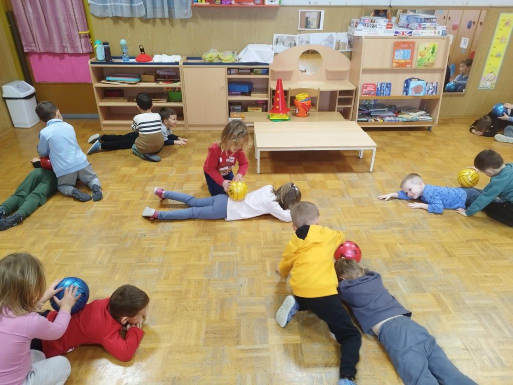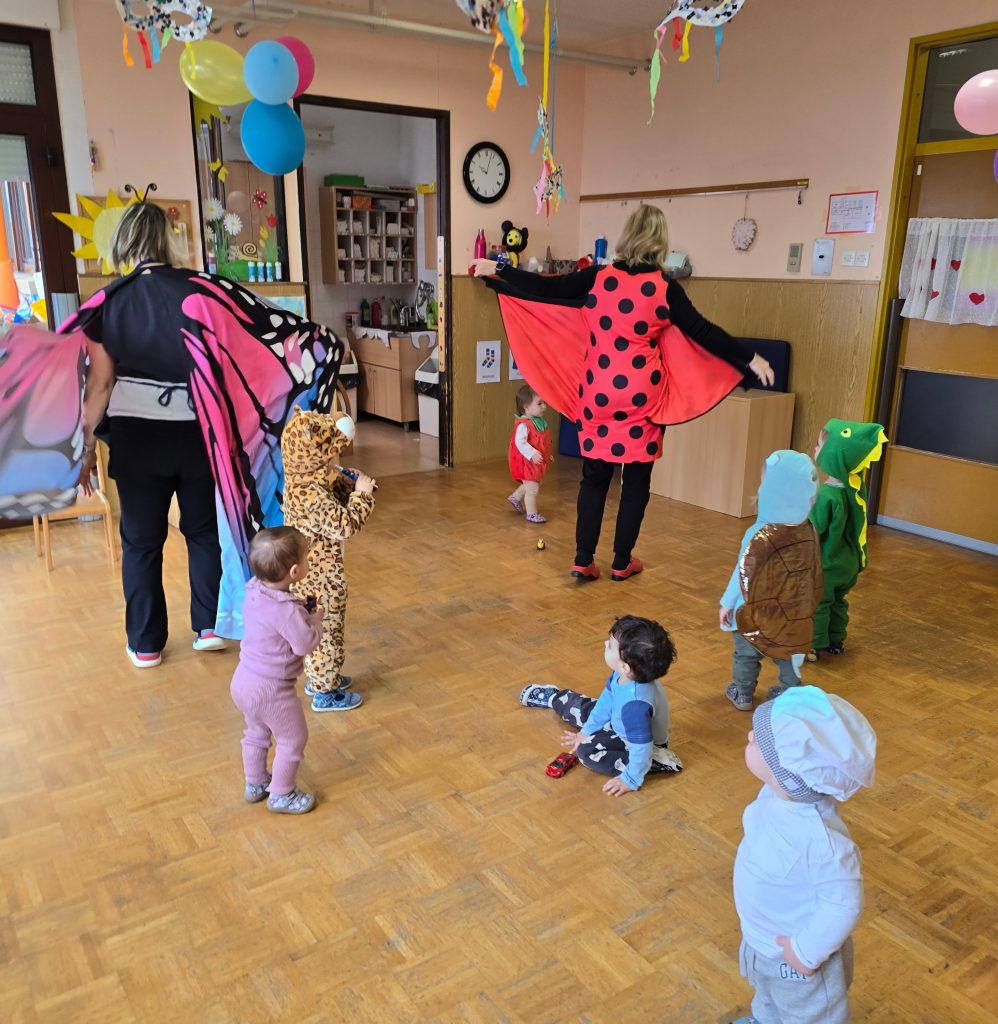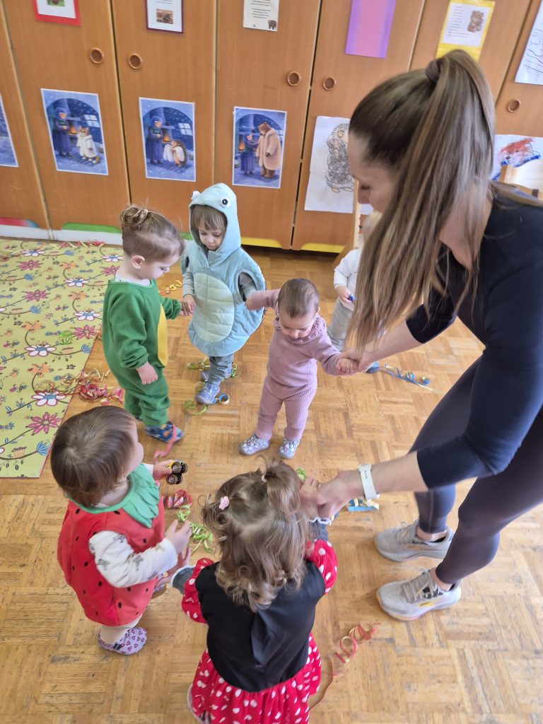 V oddelku najmlajših otrok je februarja skozi dejavnosti spremljala lutka Piki, ki je otrokom postala stalni spremljevalec pri igri in učenju. Ob poslušanju zgodbe Kje je Piki? so otroci z zanimanjem spremljali dogajanje ter preko igre razvijali besedišče, spoznavali živali in preproste prostorske pojme (pod, v, za, noter, zunaj). Lutko smo vsakodnevno vključevali v različne dejavnosti – otroci so jo iskali po igralnici, ji gradili hišico iz kock, jo uspavali ter jo vključevali v prosto igro. Preko igre z barvnimi kockami so otroci spoznavali osnovne barve in jih razvrščali. Pustno obdobje smo obogatili z rajanjem, plesom, preizkušanjem kostumov in skupnim druženjem. Mesec je bil prežet z igro, gibanjem in raziskovanjem.