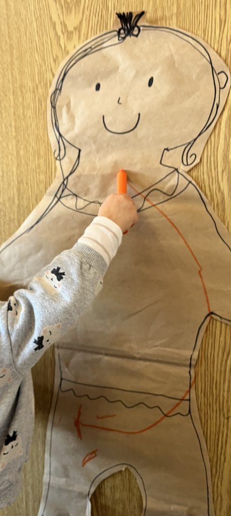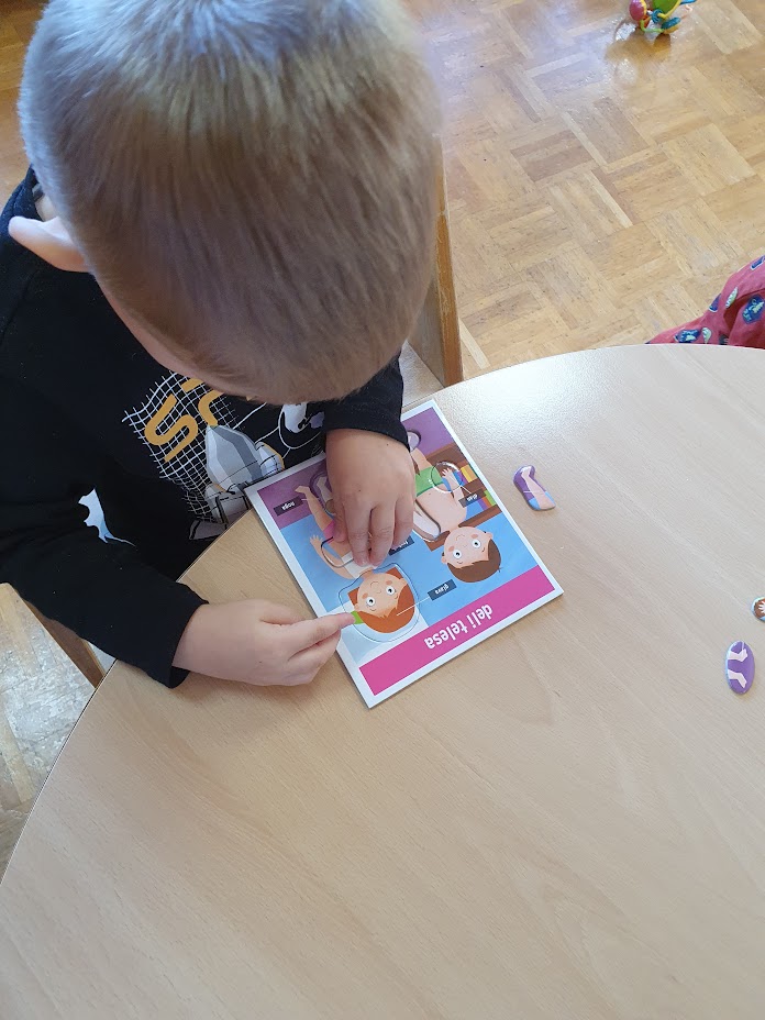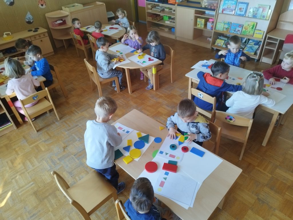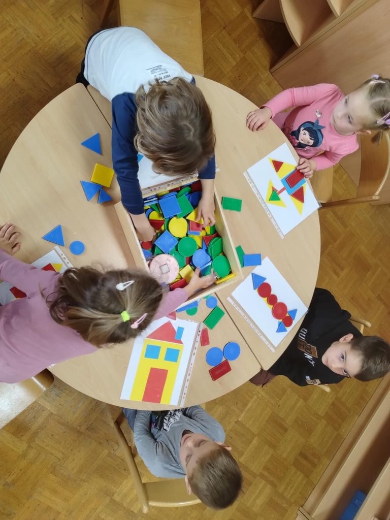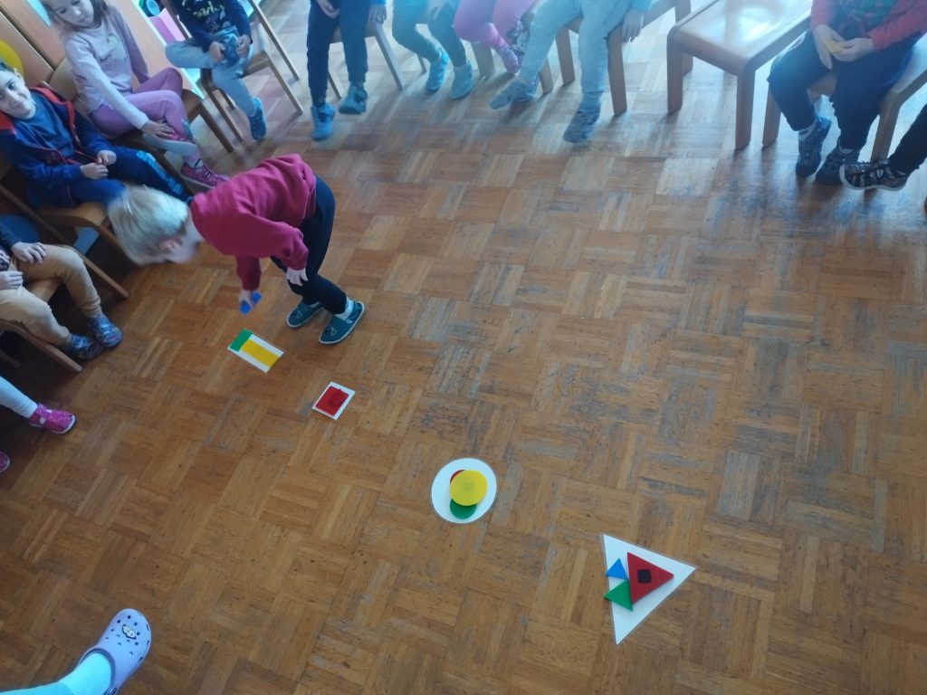 Veliko časa smo posvetili tudi spoznavanju geometrijskih likov. Otroci so jih iskali po igralnici, jih risali ter iz njih sestavljali podobe, podobne človeškemu telesu. S tem so razvijali prostorsko predstavo, ustvarjalnost in matematično razmišljanje.