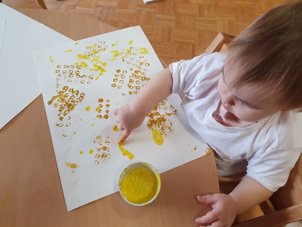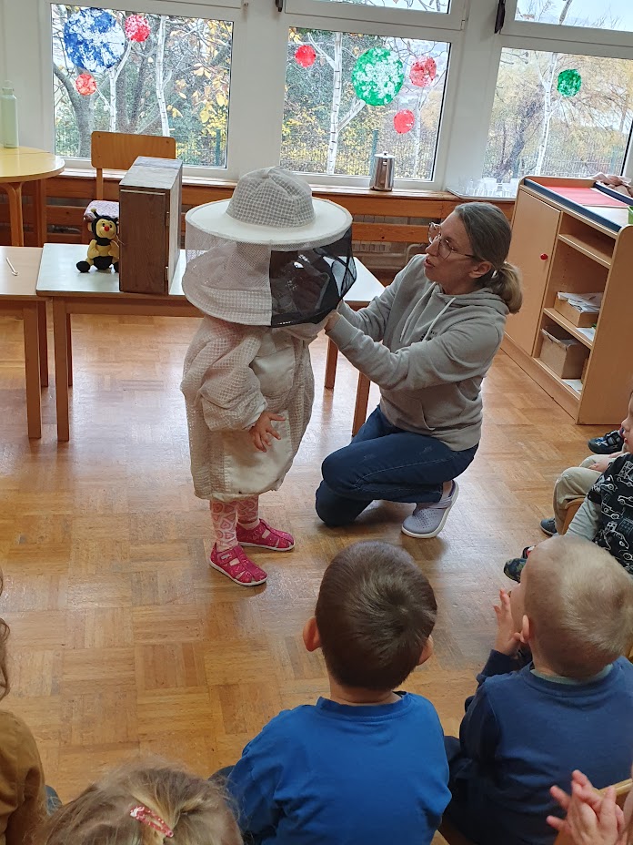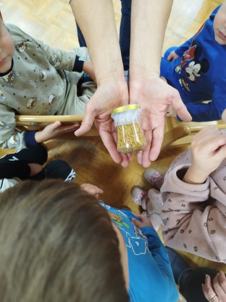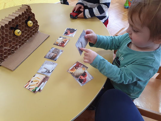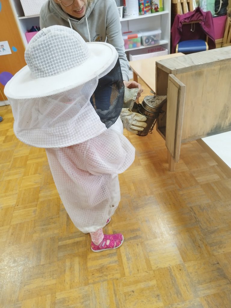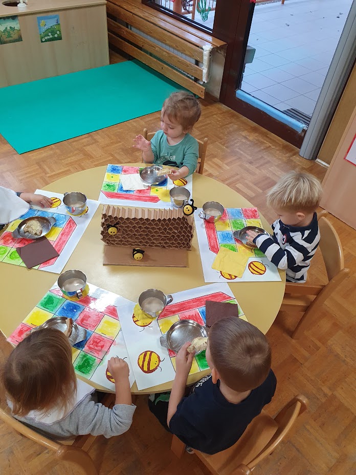 Mesec je zaznamoval tudi tematski sklop o čebelah in kmetiji. Spoznavanje poklica čebelarja, satovja, pridelave hrane in življenja na kmetiji je otroke spodbudilo k pripovedovanju, k raziskovanju skozi igro, slikanju in gibanju. Tradicionalni slovenski zajtrk je bil priložnost za povezovanje zgodbe s konkretnim doživetjem, otroci pa so ob tem uživali v okušanju hrane.