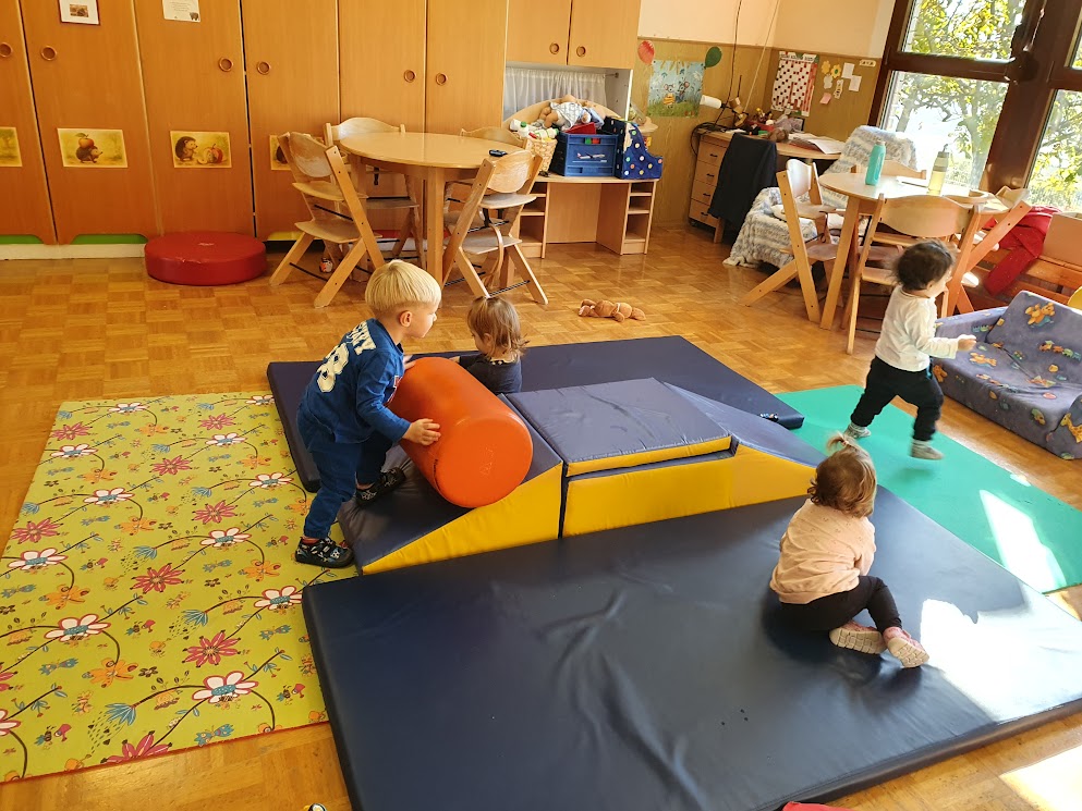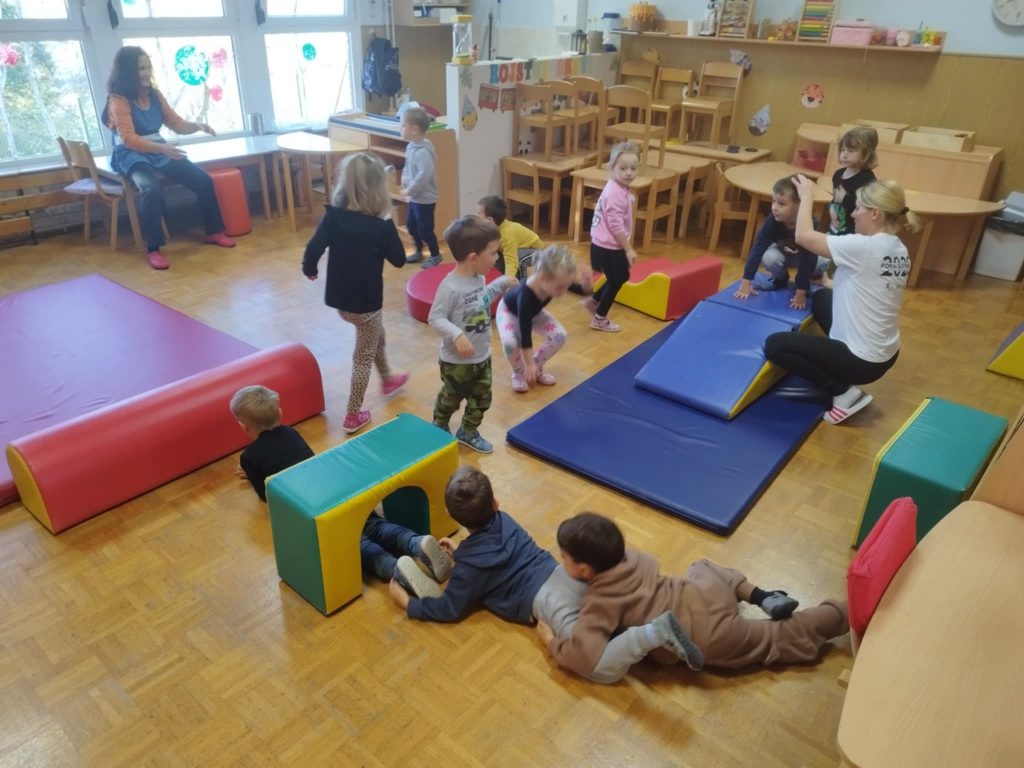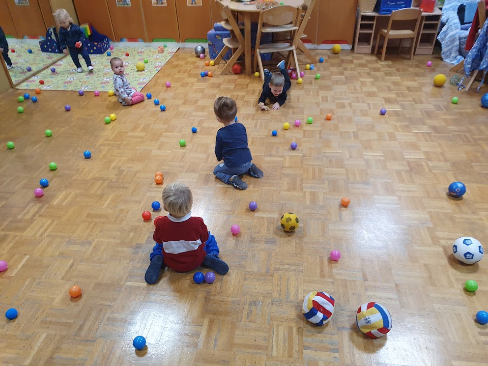 Gibalne dejavnosti so bile del vsakdanjika. Otroci so se veliko plazili, plezali, metali žoge, lovili ravnotežje na različnih poligonih.