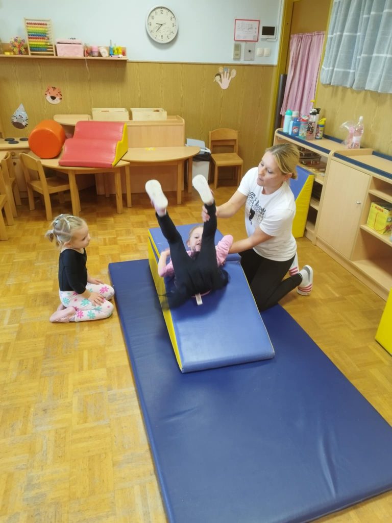 Obiskala nas je trenerka gimnastike, ki nam je pripravila razgiban gibalni poligon. Otroci so z veseljem izvajali različne gimnastične vaje, pri katerih so razvijali moč, koordinacijo in ravnotežje.