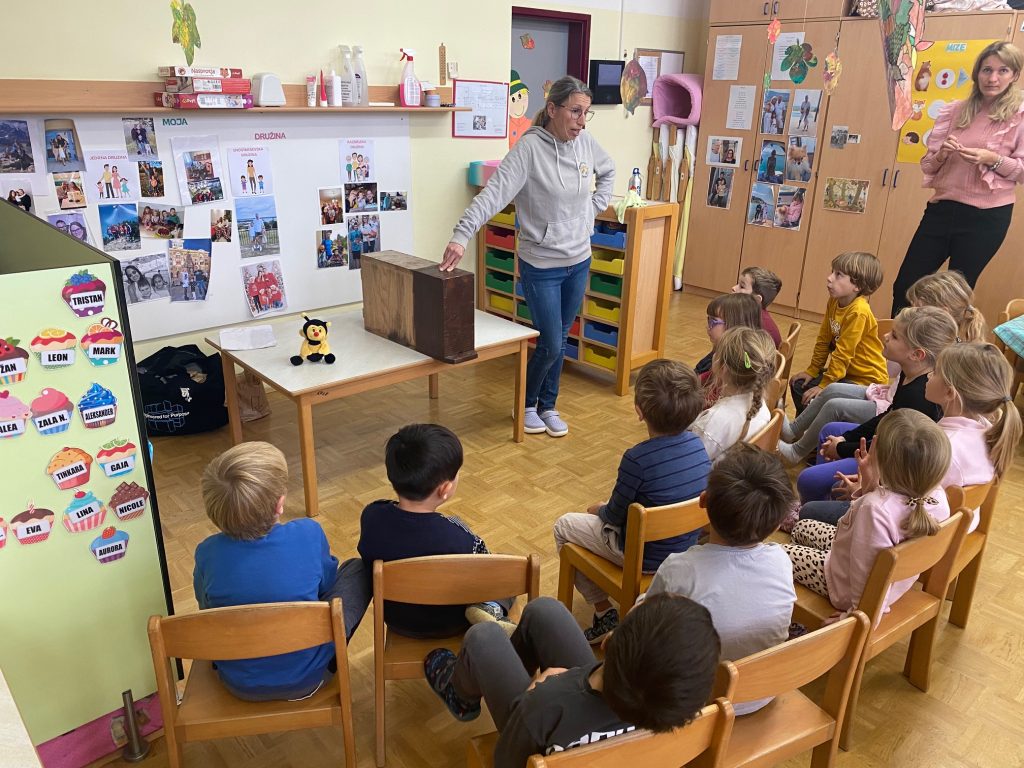 Posebno doživetje je bil obisk čebelarke Mateje, ki nam je predstavila svoj poklic. Otroci so z zanimanjem poslušali, opazovali in spoznavali čebelji pan ter izvedeli veliko novega o pomenu čebel za naravo in človeka.