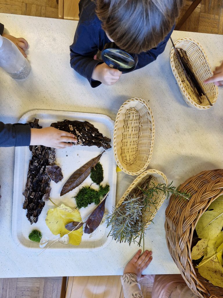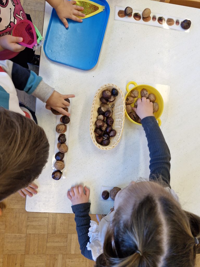 November smo začeli z raziskovanjem jesenske narave v bližnji okolici. Otroci so z vsemi čutili radovedno odkrivali jesenske plodove. Del zbranih plodov smo prinesli tudi v igralnico, kjer so otroci nadaljevali z raziskovanjem in ustvarjanjem. Topli, sončni dnevi so bili kot nalašč za sproščeno gibanje na prostem, opazovanje sprememb v naravi ter doživljanje jeseni na najbolj pristen način.