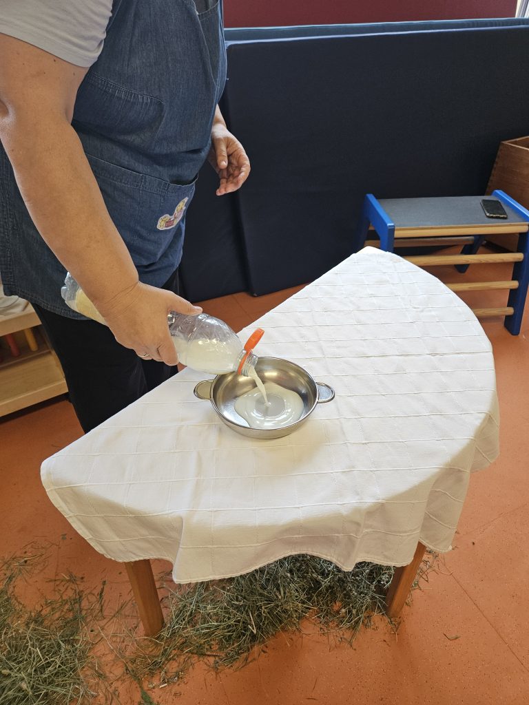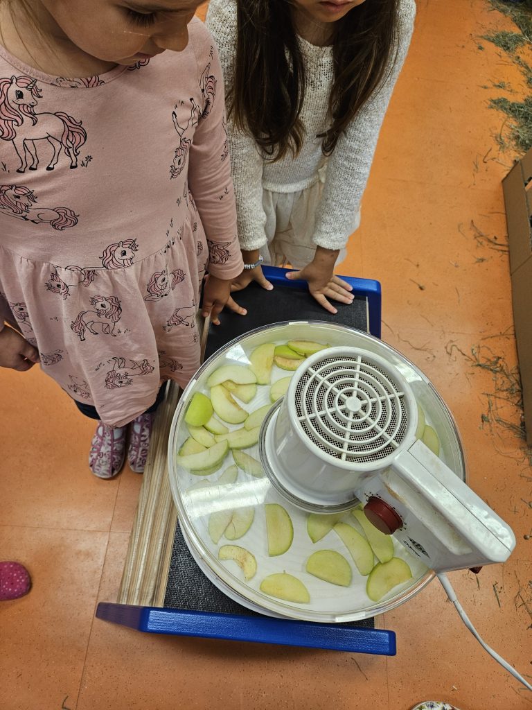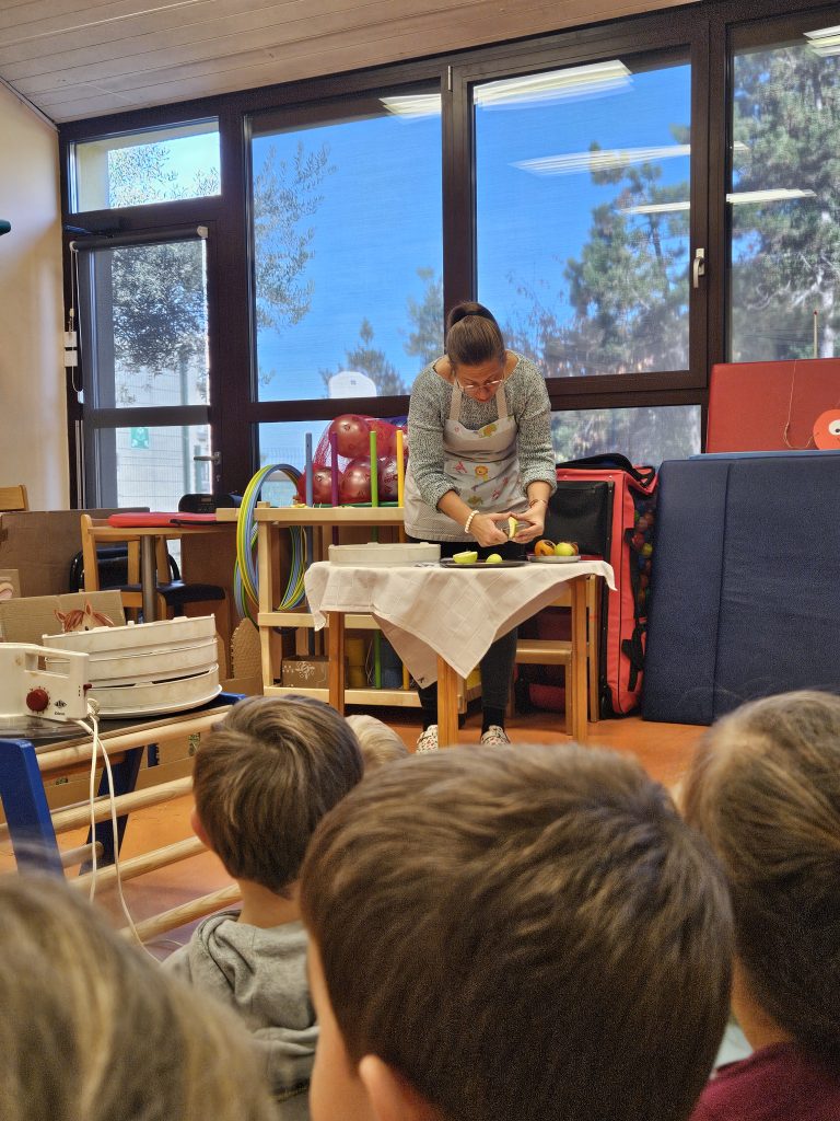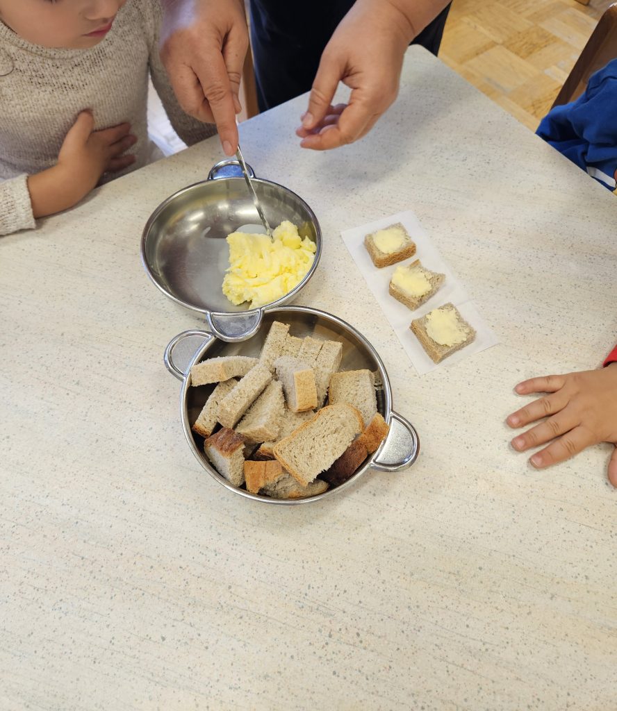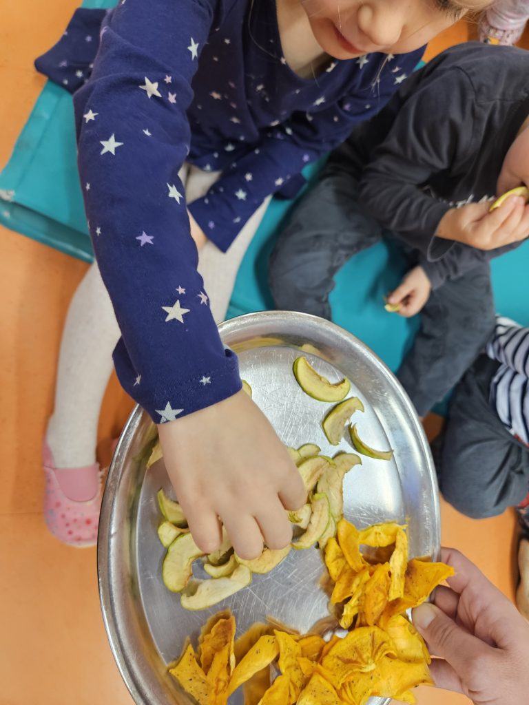 Skupaj smo izdelovali domače maslo, sušili jabolka in kaki ter ustvarjali pisane pogrinjke, s katerimi smo okrasili mize. Otroci so skozi izkustveno učenje spoznavali postopke priprave hrane, razvijali svoje spretnosti ter krepili zavedanje o pomenu zdravega prehranjevanja.