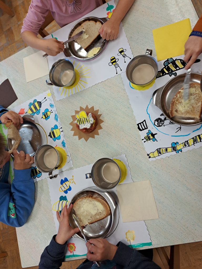 Kot vsako leto smo tudi letos v vrtcu obeležili Tradicionalni slovenski zajtrk. Otroci so spoznali pomen lokalno pridelane hrane, slovenskega čebelarstva ter vlogo pridelovalcev v našem okolju. Posebno pozornost smo namenili živilom, ki jih zajtrk tradicionalno vključuje (med, maslo, mleko,kruh, jabolka).