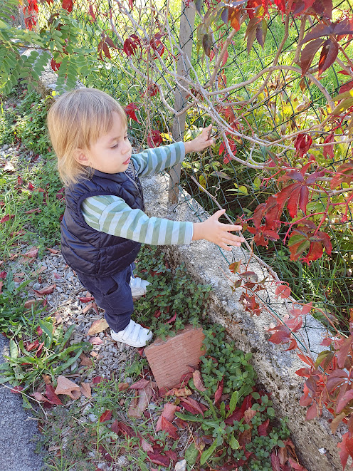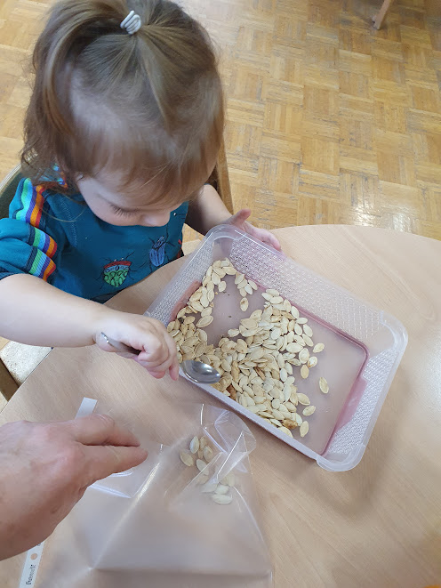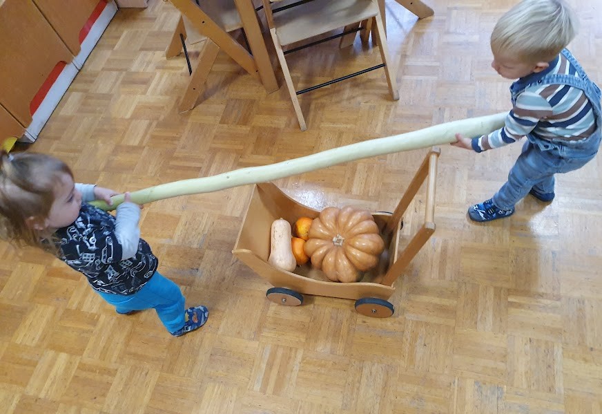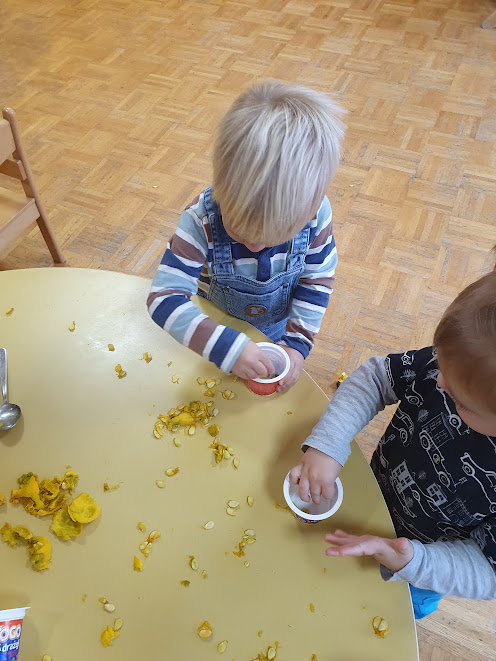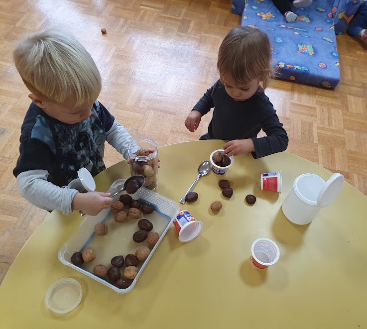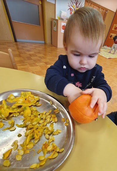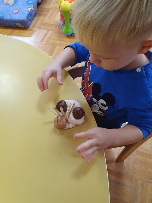 V naši skupini smo jesen doživljali z vsemi čuti. Otroci so raziskovali jesenske plodove in naravne materiale – buče, kostanje, orehe, semena, storže in listje. Z zanimanjem so jih opazovali, tipali, vohali, prenašali in razvrščali, pri tem pa krepili radovednost, fino motoriko in natančnost.