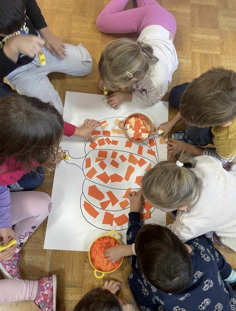 Veliko zanimanja je vzbudil prerez buče. Z navdušenjem so tipali mehko notranjost in gladka bučna semena, jih preštevali ter raziskovali njihovo obliko in teksturo. Nato smo skupaj ustvarili »bučo velikanko«, pri čemer so otroci z veseljem strigli jesenske liste in jih lepili na narisano bučo na risalnem listu.