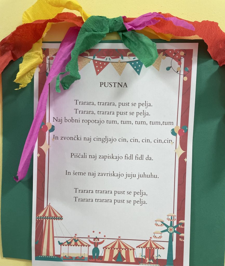 PUST 24. februarja, 2026 Otroci vseh enot Vrtca Semedela so se združili v pisanem pustnem rajanju. Skupaj smo pripravili pravo praznično vzdušje. Vzgojiteljica Anja je za nas pripravila presenečenje. Poglejte koga je povabila na obisk:🎵🎶🎸 Poslušali smo igranje na harmoniko in kitari .🎶 Zabavali smo se, plesali, se smejali in metali konfete v zrak. Tako smo si pustni dan popolnoma obarvali in napolnili s smehom. Tukaj so naši pustni izdelki… Odpravili smo se na pustno rajanje na prostem, kjer smo z glasnim petjem, ropotuljami in nasmehi na obrazih priklicali pomlad. V telovadnici smo se zabavali v pustnih kostumih. Plesali smo ob glasbi in peli pustne pesmi. Usvojili smo novo pesem in preživeli čudovit pustni dan. Dan je bil poln dobre volje in smeha. Uživali smo v družbi prijateljev in vzgojiteljic, ki so poskrbele za varnost in prijetno vzdušje.