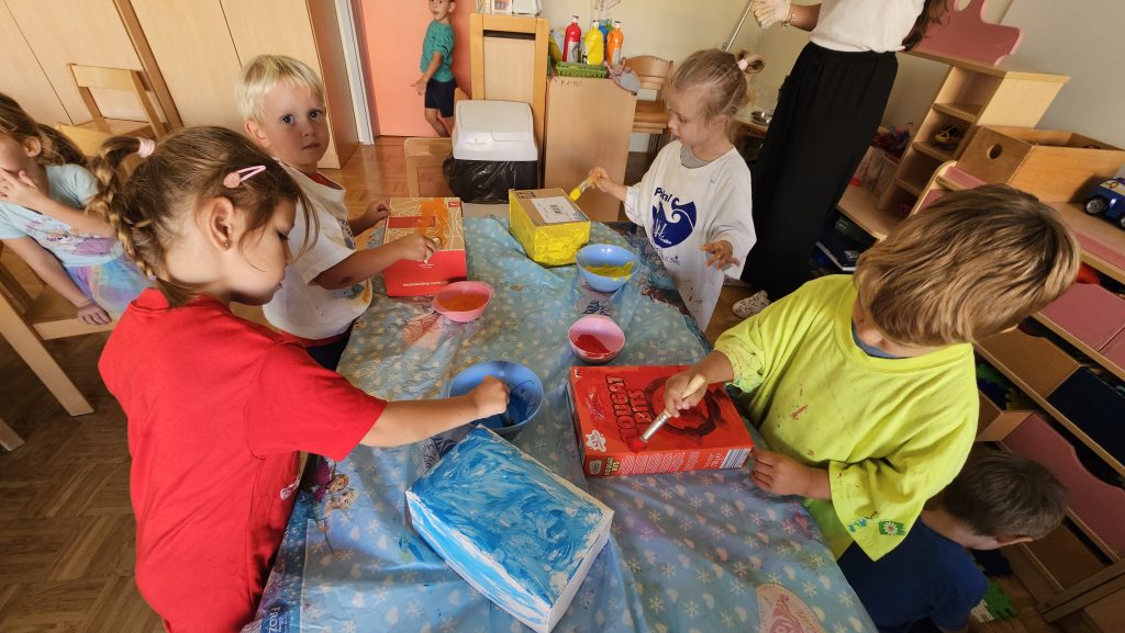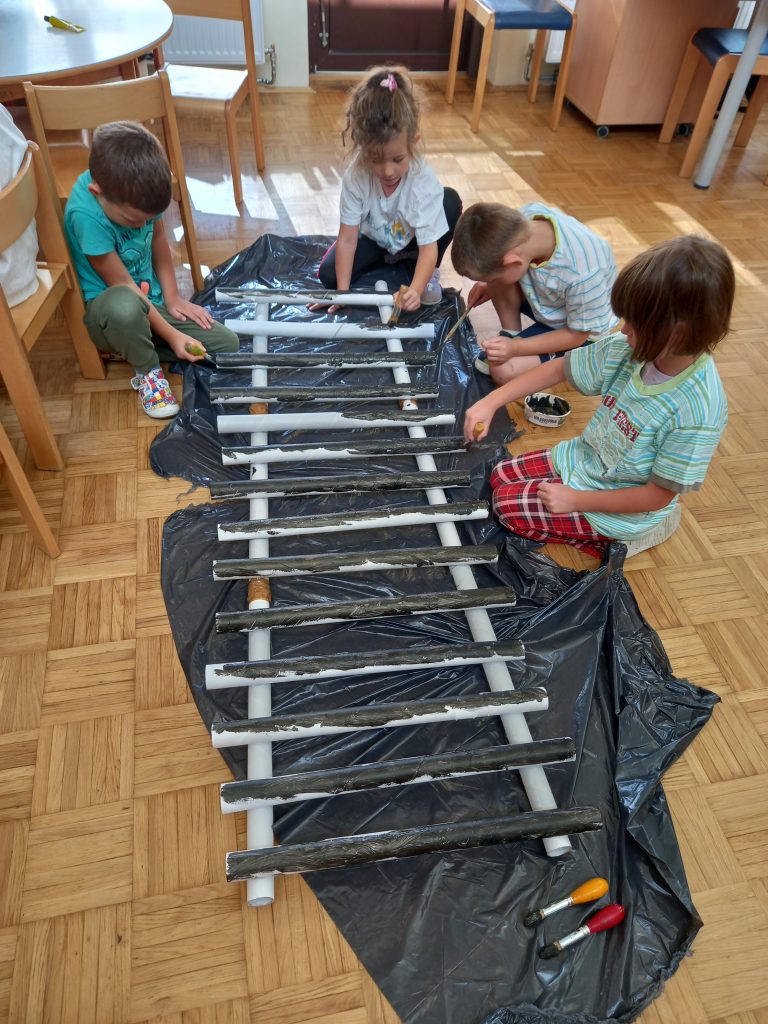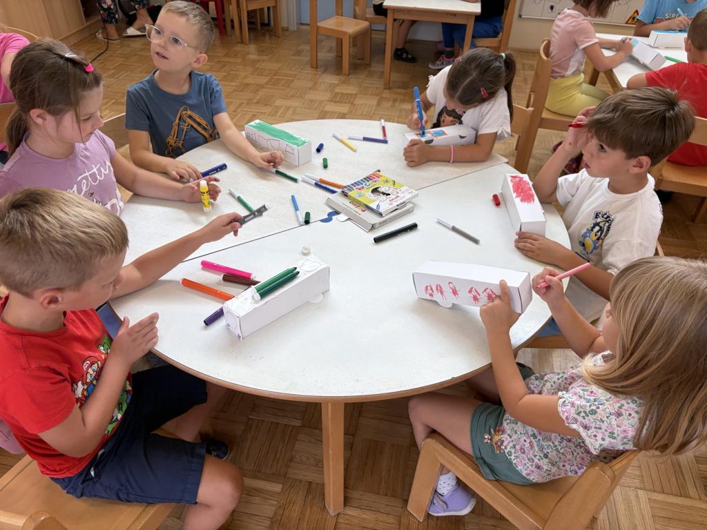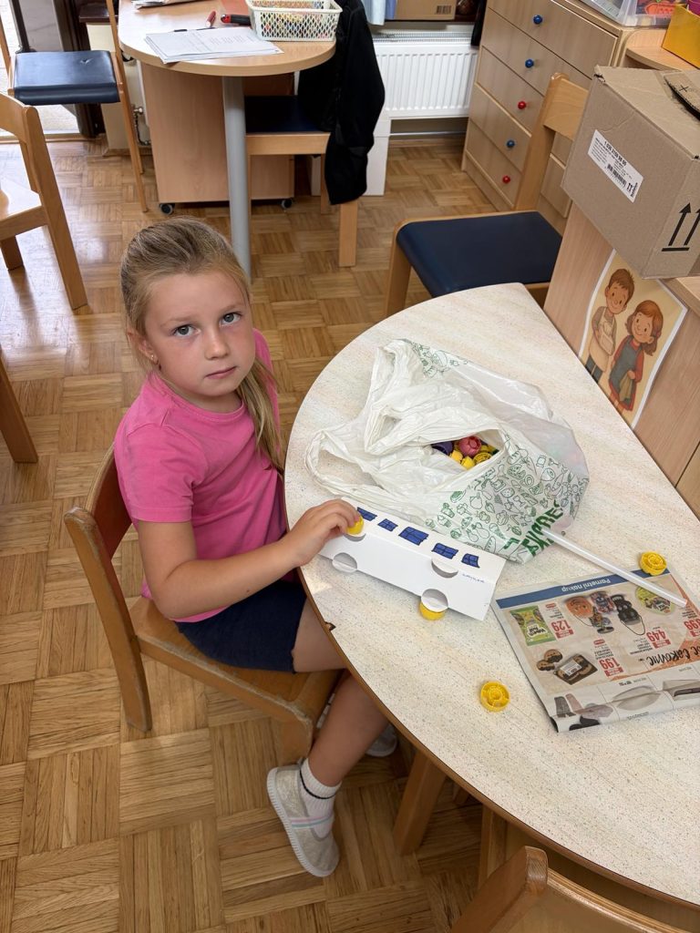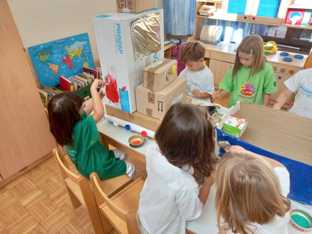 Med ustvarjanjem smo iz odpadne embalaže pričarali prave prometne čudeže – letala, avtobuse, celo vlak, ki nas je »odpeljal« kar po igralnici. Iz papirnate mreže je nastal velik rumen avtobus, ki je peljal v deželo domišljije.