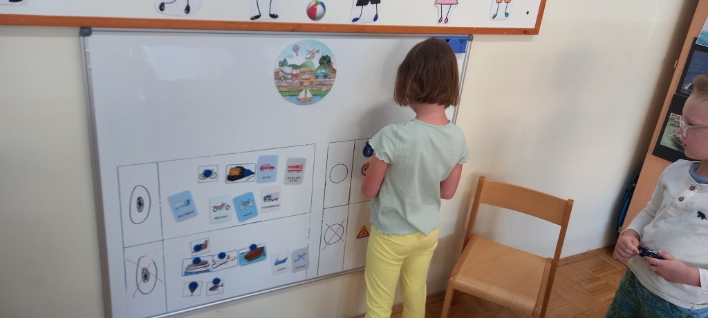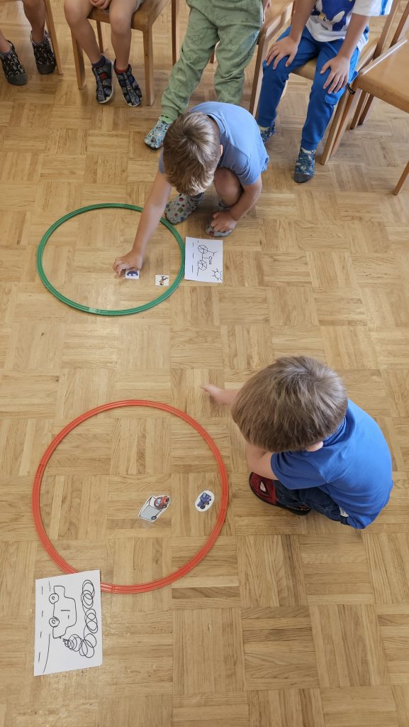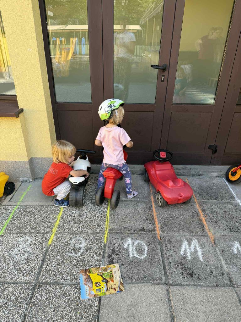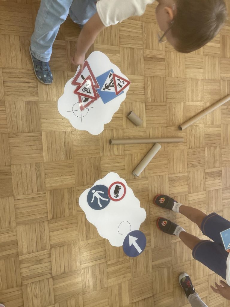 V sklopu Tedna mobilnosti smo se podali na pravo prometno raziskovanje. Ob igri »Beli zajček« smo spoznavali različna prevozna sredstva, odkrivali pravila, ki veljajo za pešce, razvrščali vozila glede na vrsto prometa in celo prepoznavali geometrijske oblike prometnih znakov. Na naših prometnih poligonih smo se prelevili v prave male voznike in pešce…vijugali smo med ovirami in pridno upoštevali prometna pravila.